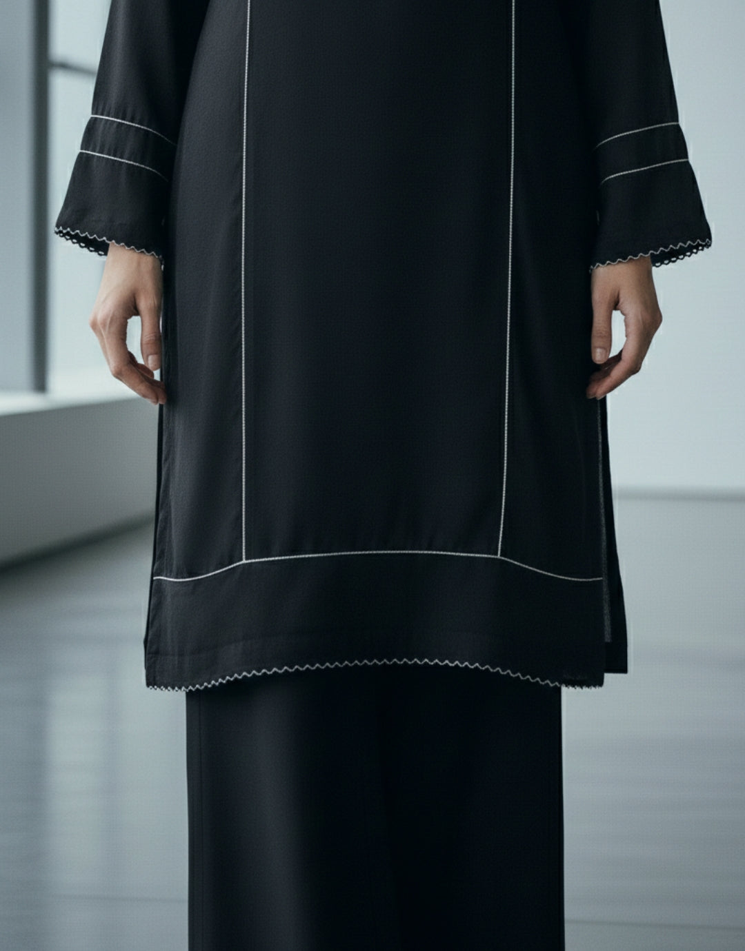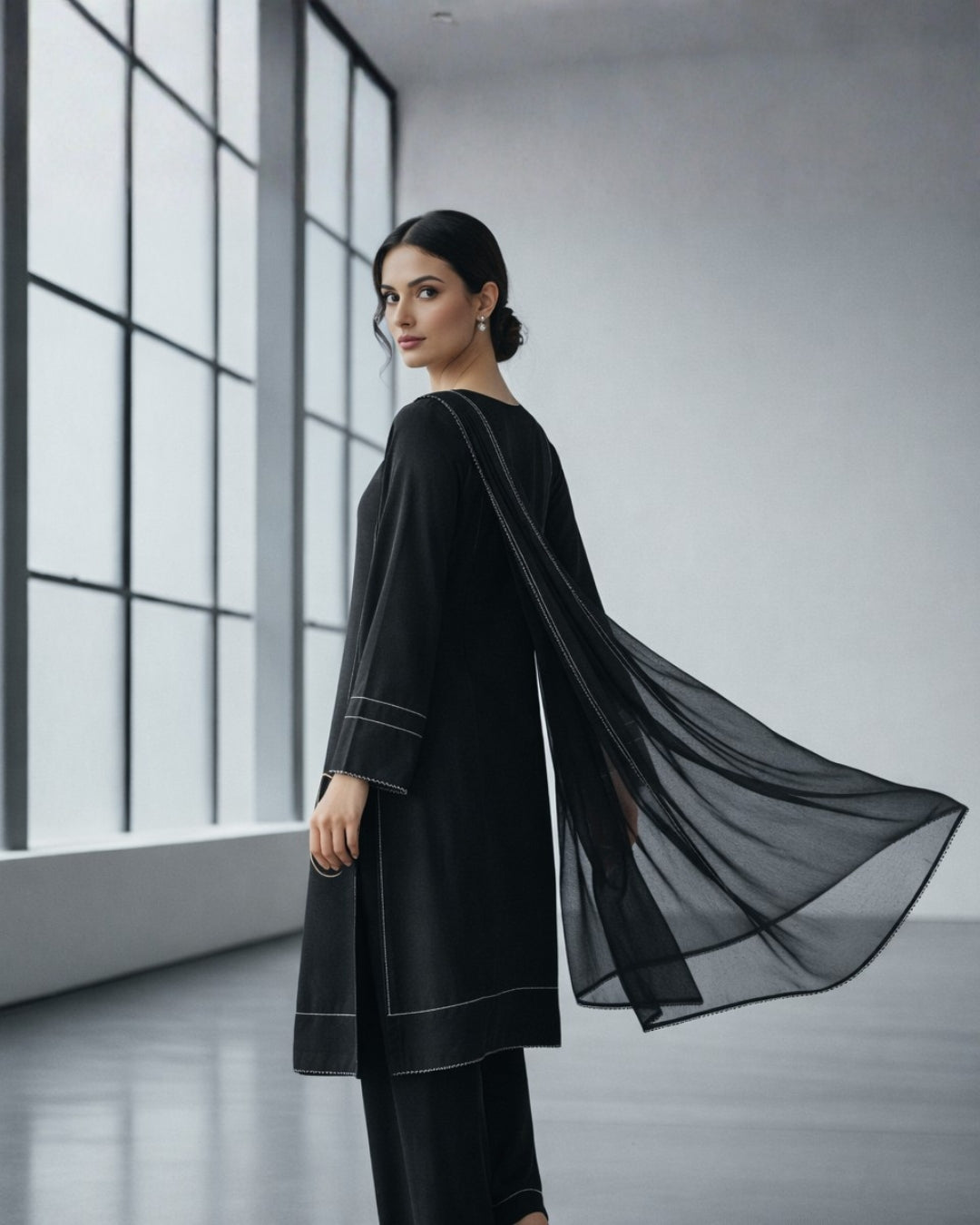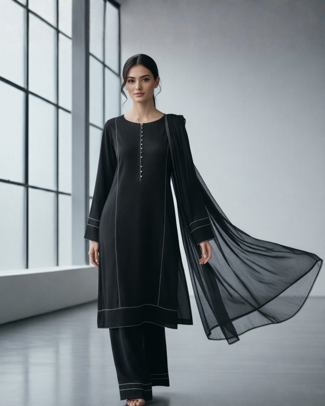 This classic black stitched set combines sophistication with understated elegance. Featuring a high-quality fabric, a button-down neckline, and detailed piping, it is perfect for formal events or evening gatherings. The sheer chiffon dupatta adds a touch of grace and flow, making this set a timeless wardrobe essential.