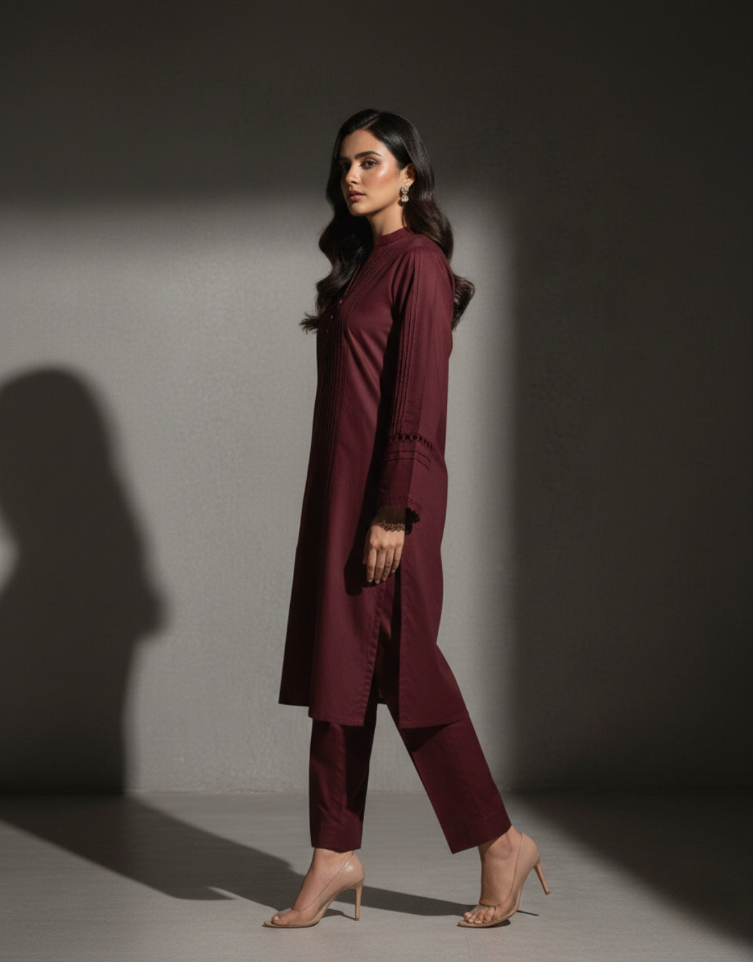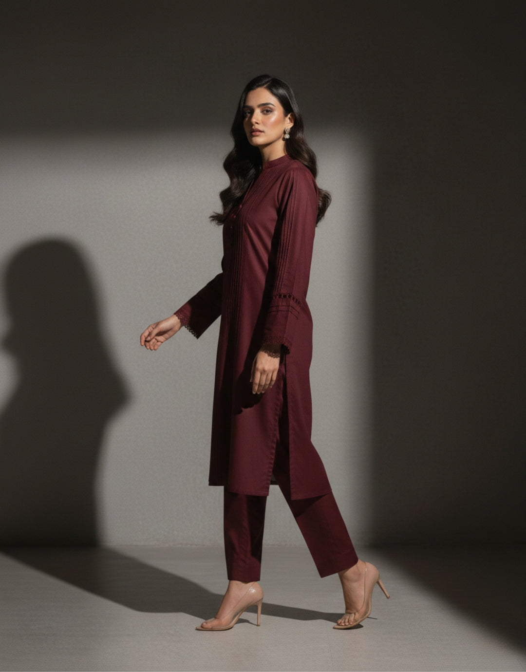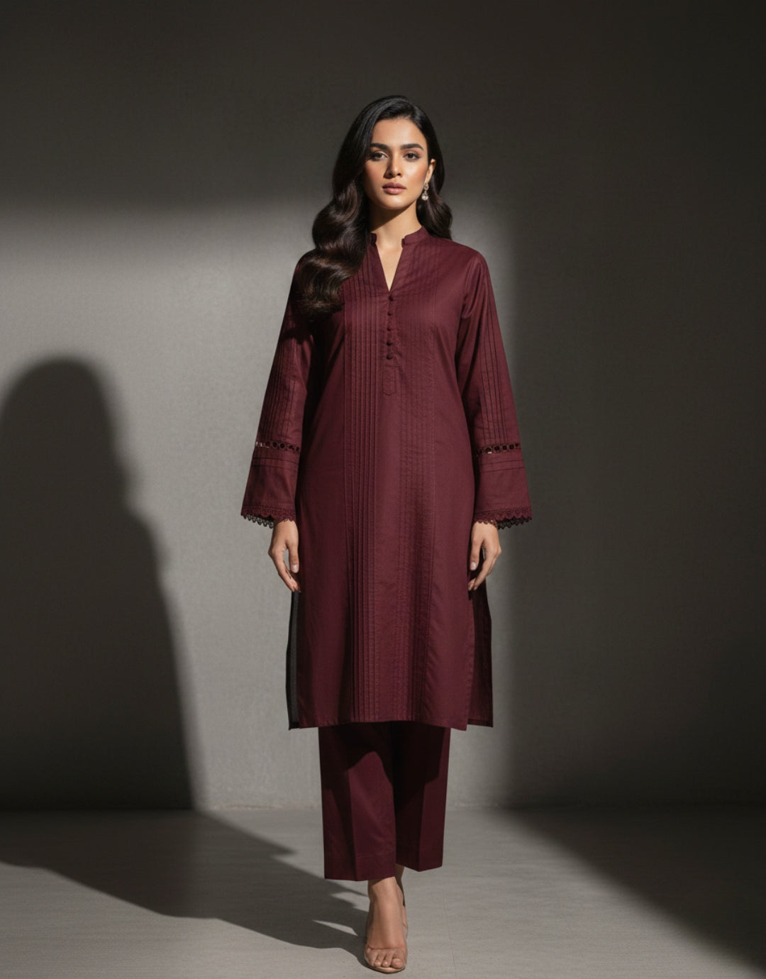 This maroon stitched set combines elegance and comfort with a delicate button-down neckline and detailed vertical stripes that add depth. The lace-trimmed sleeves give it a refined, feminine touch. Made from premium cotton, it's perfect for both casual and semi-formal occasions.