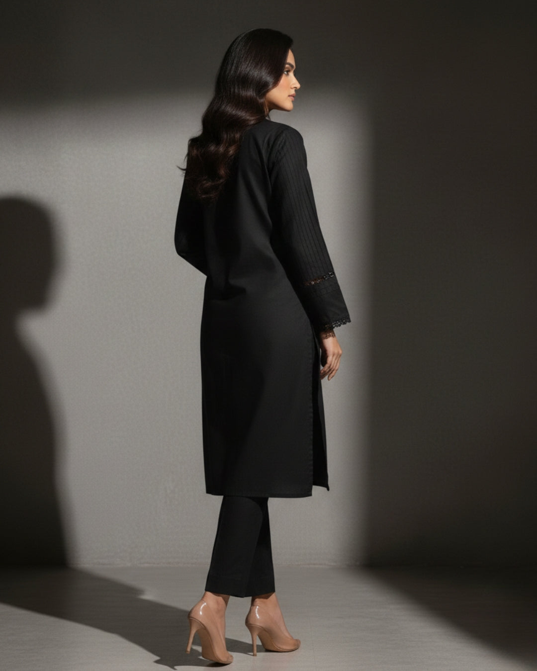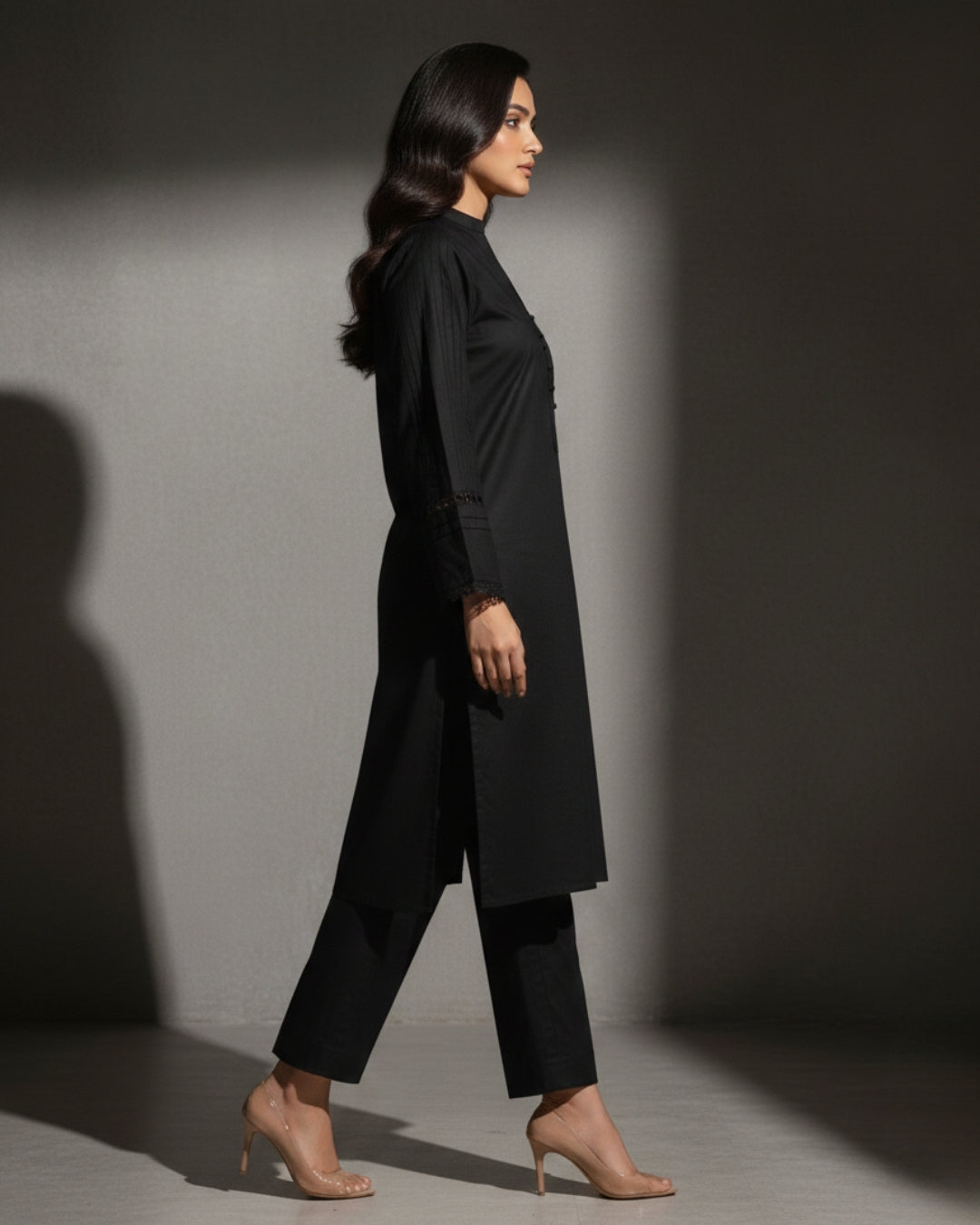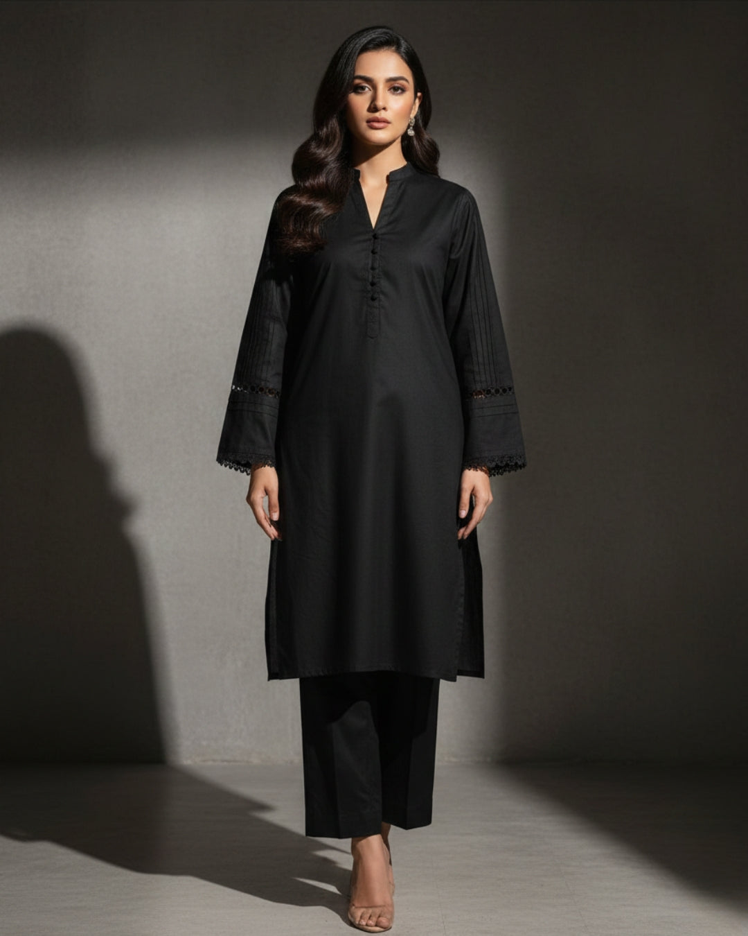 This sleek black stitched set features a structured straight silhouette with a refined buttoned neckline and subtle lace detailing on the sleeves. Designed for effortless sophistication, its premium fabric ensures comfort while maintaining a polished, formal look.