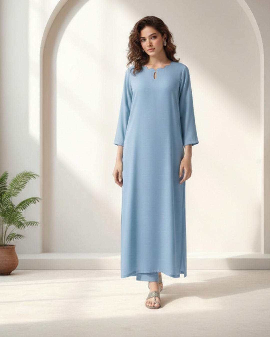 Featuring a long silhouette and a keyhole neckline, this piece offers a bohemian yet polished look. Lightweight, breathable, and tailored for comfort, it is perfect for all-day wear.