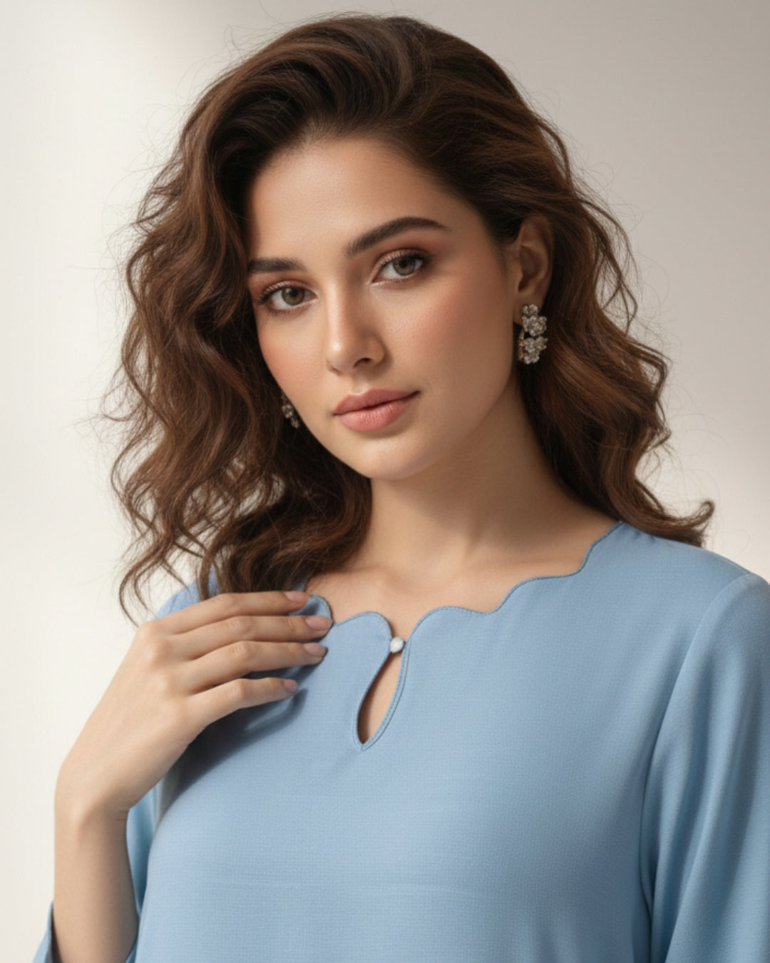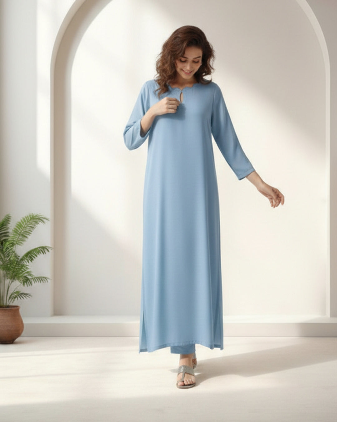 Crafted in premium quality cotton, this stitched light blue maxi kurta is designed for airy everyday elegance. The soft sky tone adds a refreshing feel, making it a versatile choice for relaxed outings.